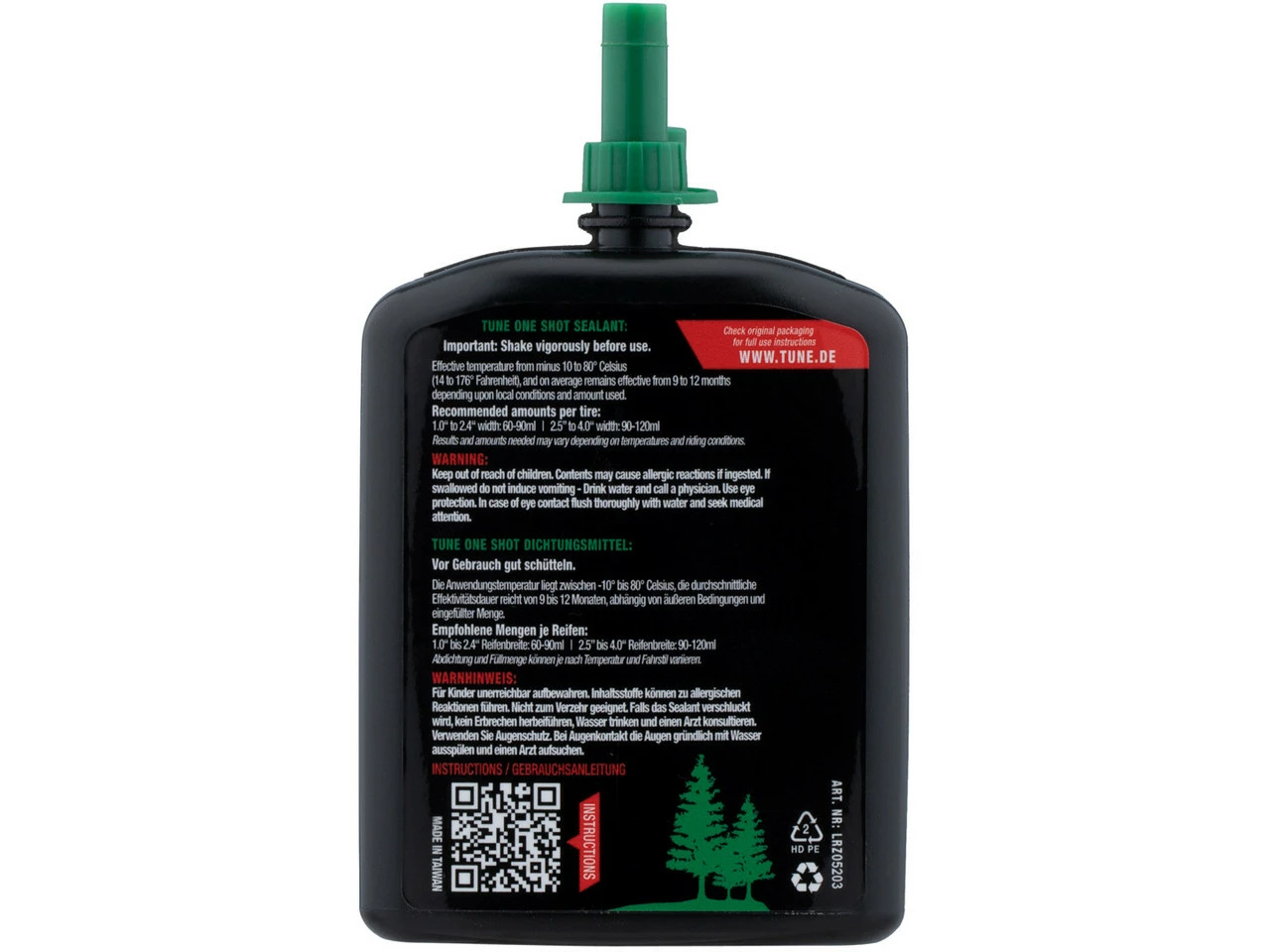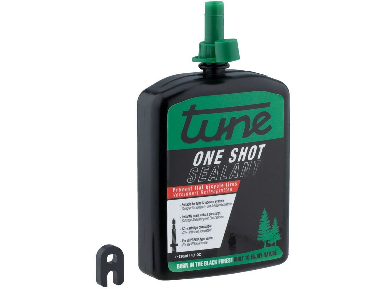 1.0“ bis 2.4“ Reifenbreite: 60-90 ml2.5” bis 4.0“ Reifenbreite: 90-120 mlAnwendung:vor Gebrauch gut schüttelnSpitze abschrauben, Verschlusssiegel abziehen und anschließend Spitze wieder aufschraubenentfernen des Ventilkernes mittels des im Flaschenboden integrierten VentilkernwerkzeugsEndkappe von der Spitze abnehmen und in die Öffnung des Ventils stecken, dabei auf 12 Uhr Stellung des Ventils achten um ein ungewolltes Auslaufen zu verhindernLaufrad um 180° drehen, so dass die Flasche auf 6 Uhr Stellung steht und den Inhalt in den Reifen drückenOne Shot Flasche entfernen, Endkappe aufstecken und den Ventilkern mittels Werkzeug einschrauben (nicht überdrehen)Ventilkernwerkzeug wieder in die vorgesehene Öffnung im Boden der Flasche klemmenReifen mit Luftpumpe, Kompressor oder CO² Patronen aufpumpenHerstellernummern:60 ml:LRZ05200120 ml:LRZ052031 Liter:LRZ05201Lieferumfang:1 x Reifendichtmittel tune One Shot